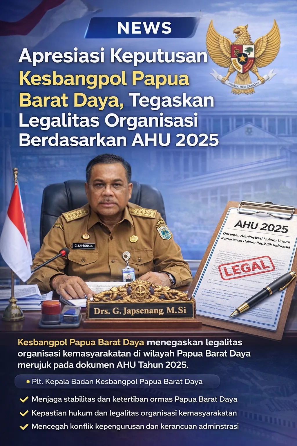 Dengan adanya penegasan tersebut, diharapkan seluruh pihak dapat menghormati keputusan administratif pemerintah daerah serta menjadikan legalitas organisasi yang tercatat pada sistem AHU Tahun 2025 sebagai rujukan resmi dalam menjalankan aktivitas organisasi di wilayah Provinsi Papua Barat Daya.