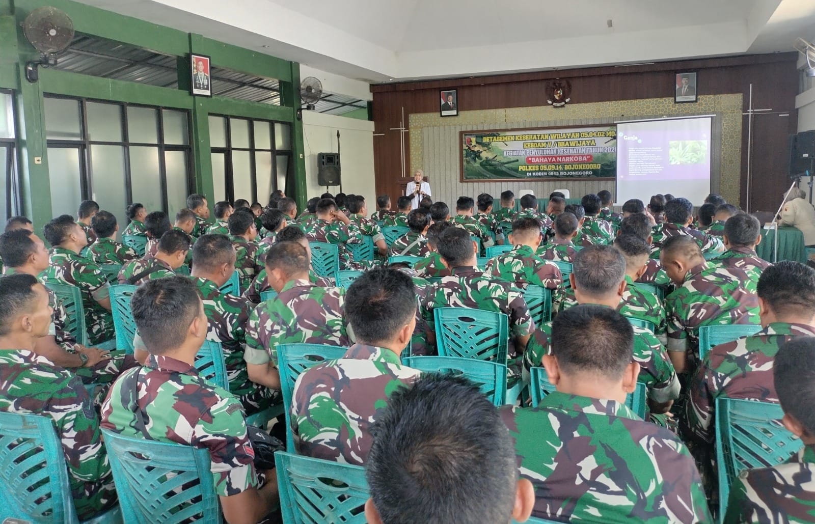 BOJONEGORO, – Poliklinik Kesehatan (Polkes) 05.09.14 Bojonegoro, bekerja sama dengan Kodim 0813 Bojonegoro menggelar kegiatan penyuluhan kesehatan tentang bahaya narkoba di Aula Ahmad Yani Markas Kodim 0813 Bojonegoro, Jawa Timur, Jum’at (17/4/2026).