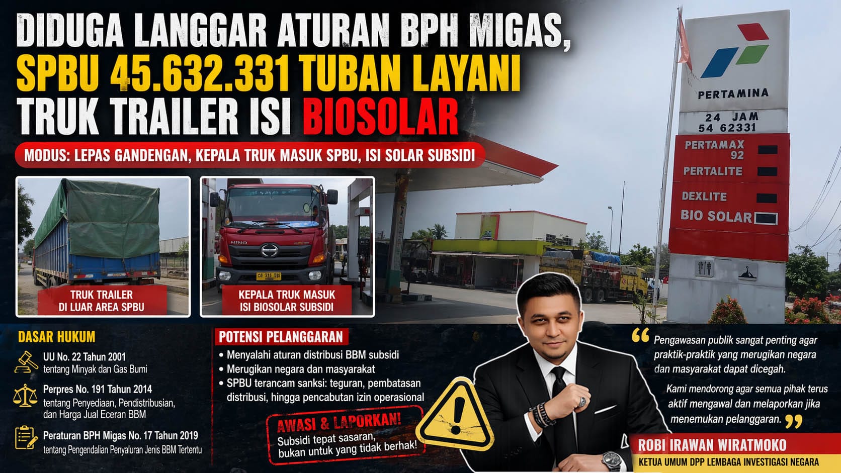 Dalam perkembangan terbaru, Ketua Umum DPP Lembaga Investigasi Negara Robi Irawan Wiratmoko menyampaikan apresiasi tinggi terhadap tim investigasi yang telah berhasil mengungkap dugaan praktik penyalahgunaan BBM subsidi ini. Ia menilai temuan tersebut sebagai bentuk nyata kontrol sosial dalam menjaga tata kelola energi yang adil dan transparan.