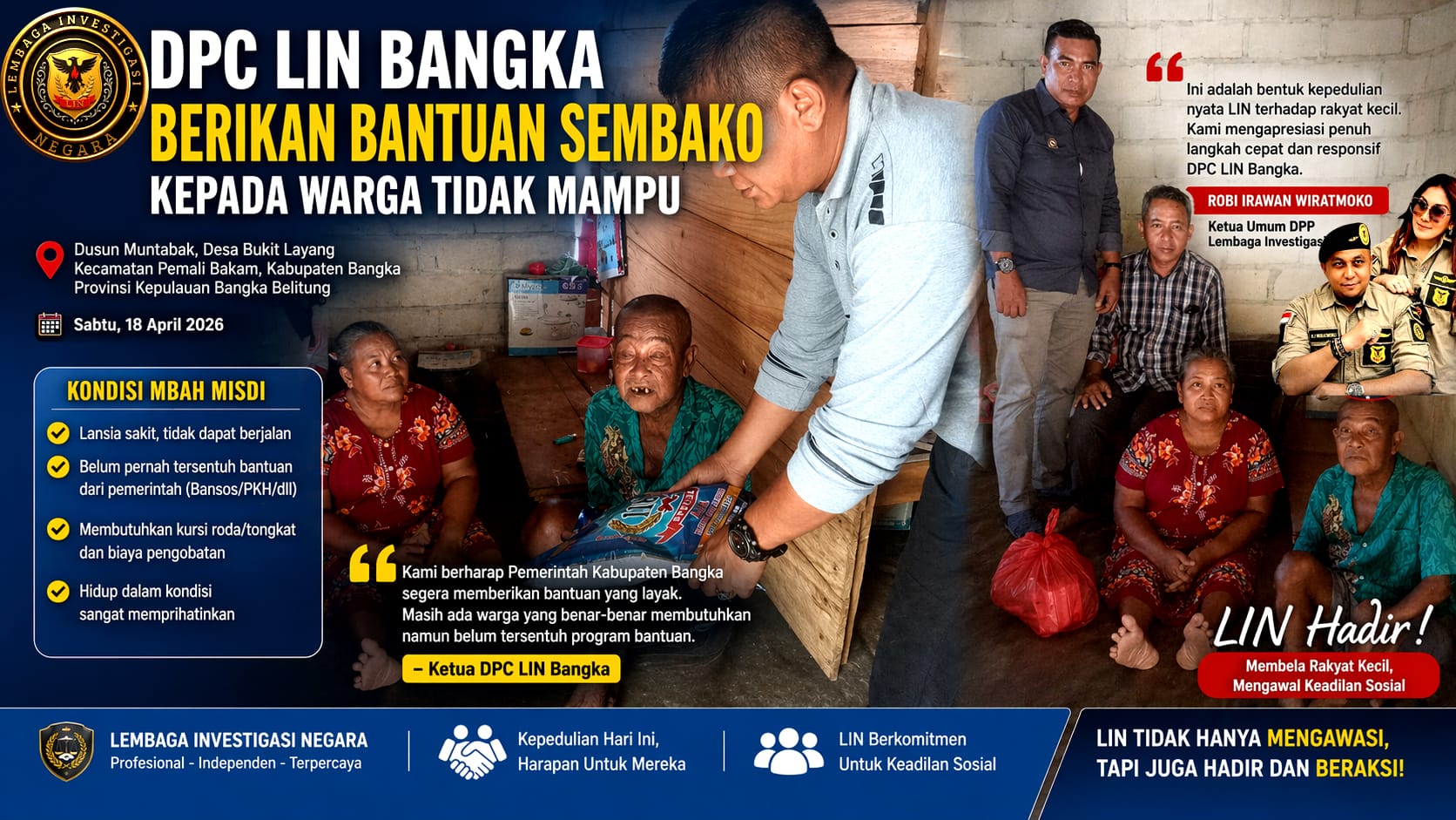 Bangka Belitung – Aksi nyata kepedulian terhadap rakyat kecil kembali ditunjukkan oleh Dewan Pimpinan Cabang (DPC) Lembaga Investigasi Negara (LIN) Kabupaten Bangka. Pada Sabtu, 18 April 2026, Ketua DPC LIN Bangka bersama tim turun langsung mengunjungi kediaman seorang warga lanjut usia yang hidup dalam kondisi memprihatinkan di Dusun Muntabak, Desa Bukit Layang, Kecamatan Pemali Bakam, Kabupaten Bangka, Provinsi Kepulauan Bangka Belitung.