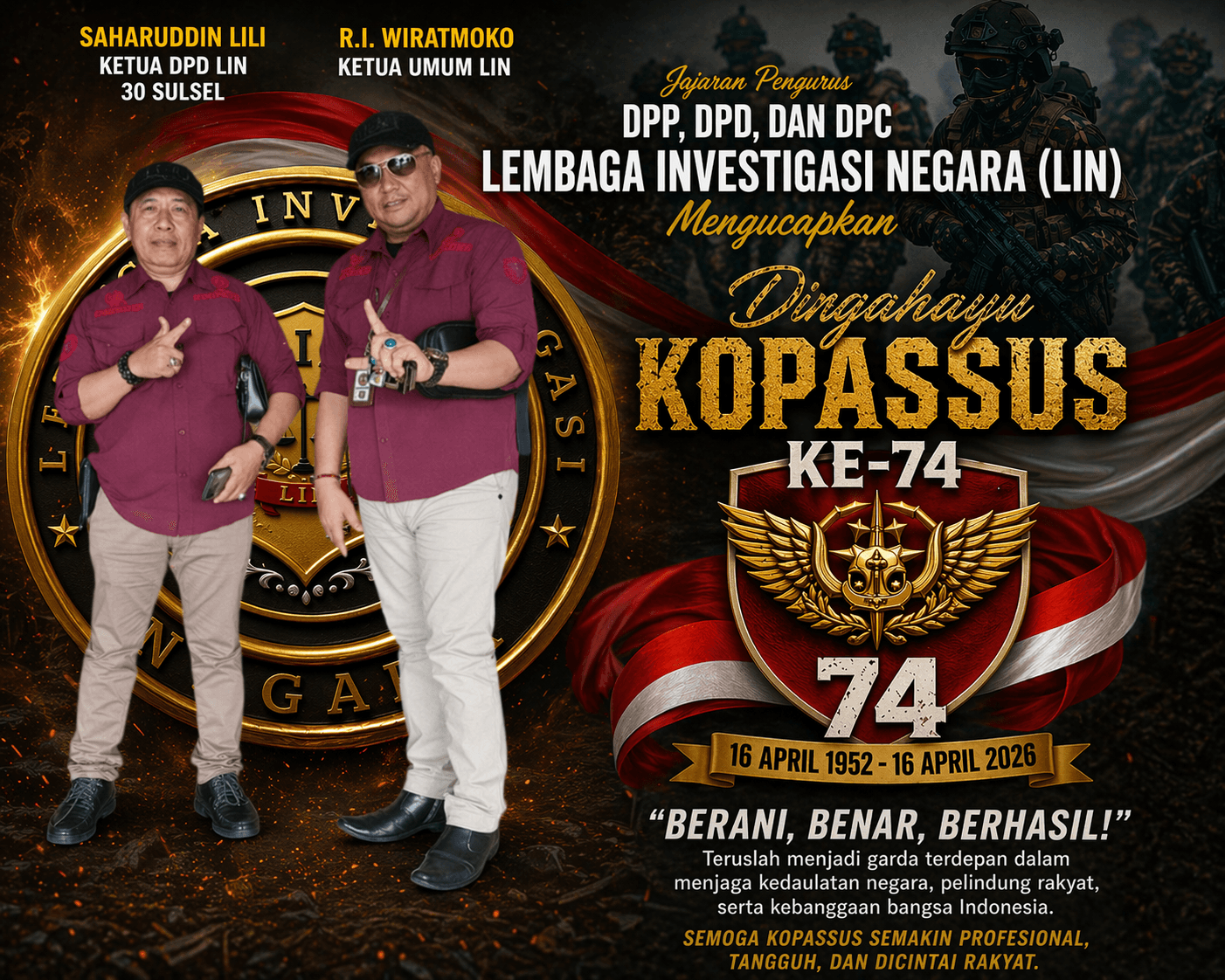 DPP, DPD, DAN DPC LIN UCAPKAN DIRGAHAYU KOPASSUS KE-74, TEGASKAN DUKUNGAN UNTUK TNI