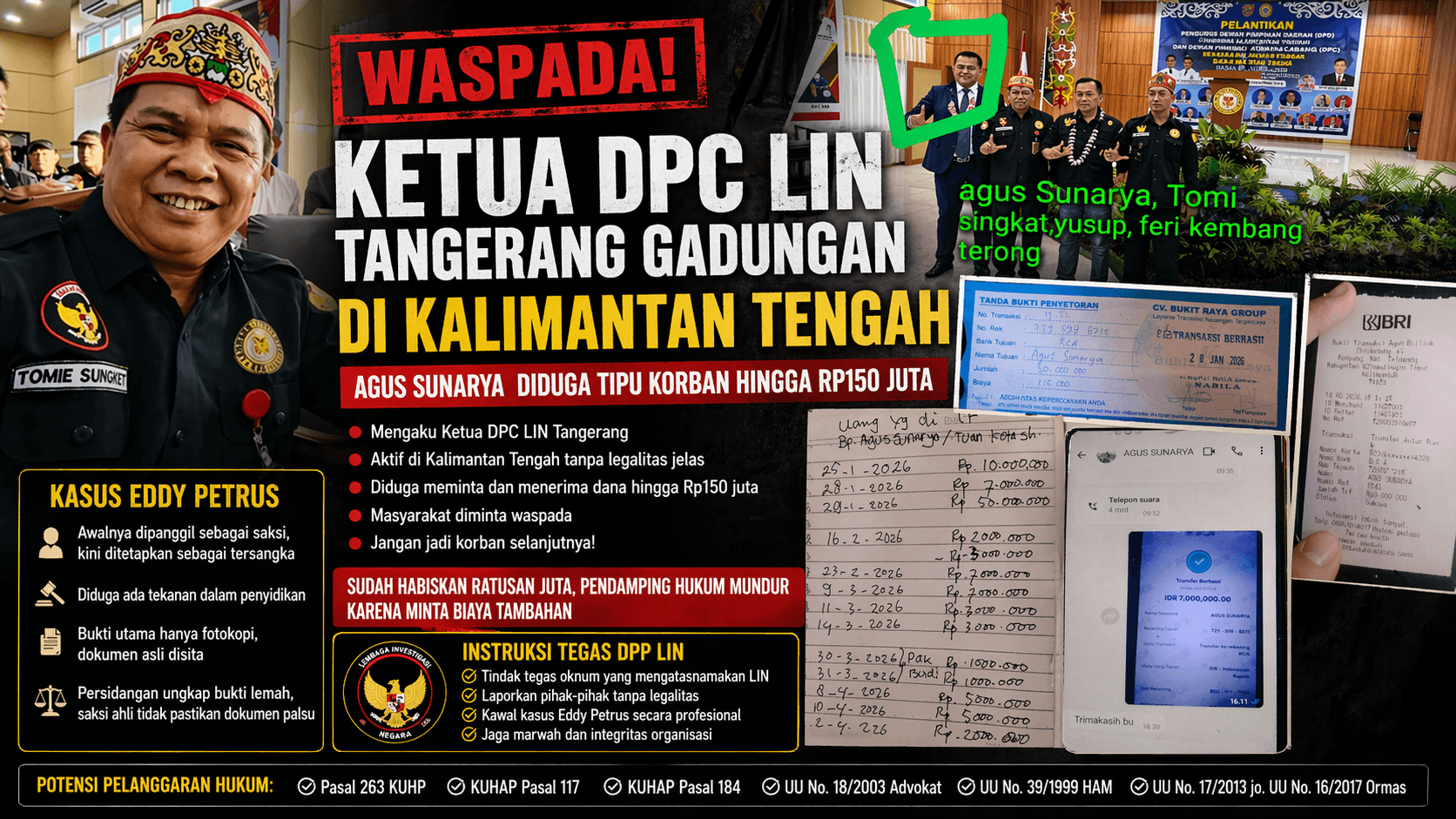 Di tengah situasi tersebut, beredar informasi mengenai sosok Agus Sunarya yang mengaku sebagai Ketua DPC LIN Tangerang/Banten dan aktif di wilayah Kalimantan Tengah.
