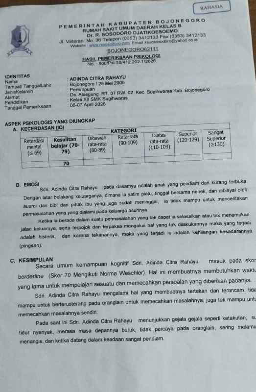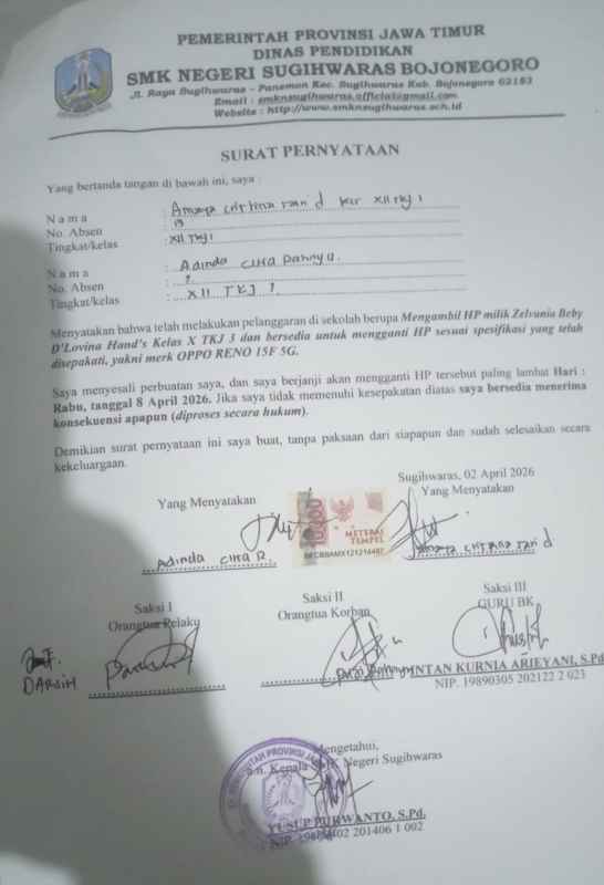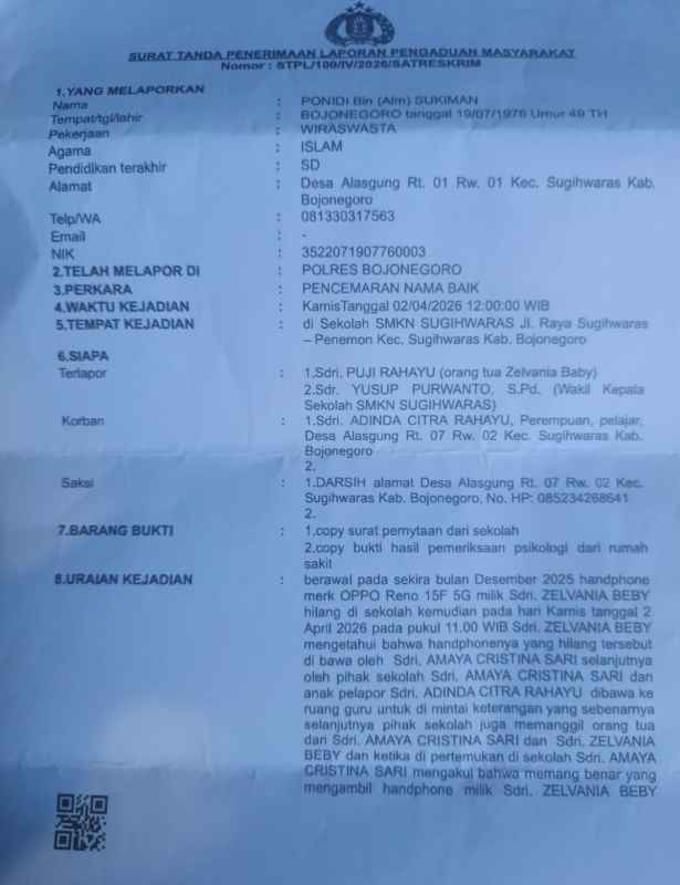 Bojonegoro — Seorang siswi berinisial ACR yang bersekolah di SMK Negeri Sugihwaras dilaporkan mengalami tekanan mental serius hingga depresi setelah diduga dipaksa mengakui keterlibatan dalam kasus pencurian telepon genggam di lingkungan sekolah.