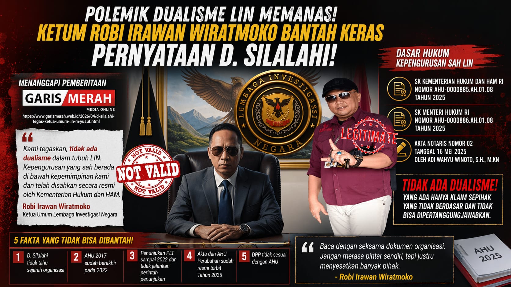 JAKARTA – Polemik kepengurusan Dewan Pimpinan Pusat (DPP) Lembaga Investigasi Negara (LIN) kian memanas setelah muncul pemberitaan dari media online Garis Merah yang mengangkat pernyataan D. Silalahi terkait klaim Ketua Umum LIN. Menanggapi hal tersebut, Ketua Umum LIN, Robi Irawan Wiratmoko, langsung memberikan bantahan tegas dan menyebut pemberitaan tersebut berpotensi menggiring opini publik yang tidak sesuai fakta hukum.