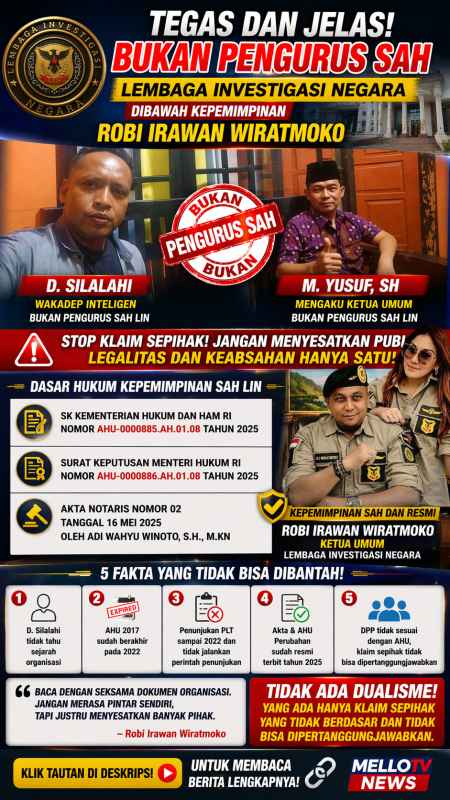 Dengan dasar hukum kuat melalui AHU 2025, kepemimpinan Robi Irawan Wiratmoko dinyatakan sebagai satu-satunya kepengurusan sah Lembaga Investigasi Negara. Sementara itu, klaim lain, termasuk yang menyebut M. Yusuf sebagai Ketua Umum, dipastikan tidak memiliki legitimasi hukum dan berpotensi berujung pada proses hukum.