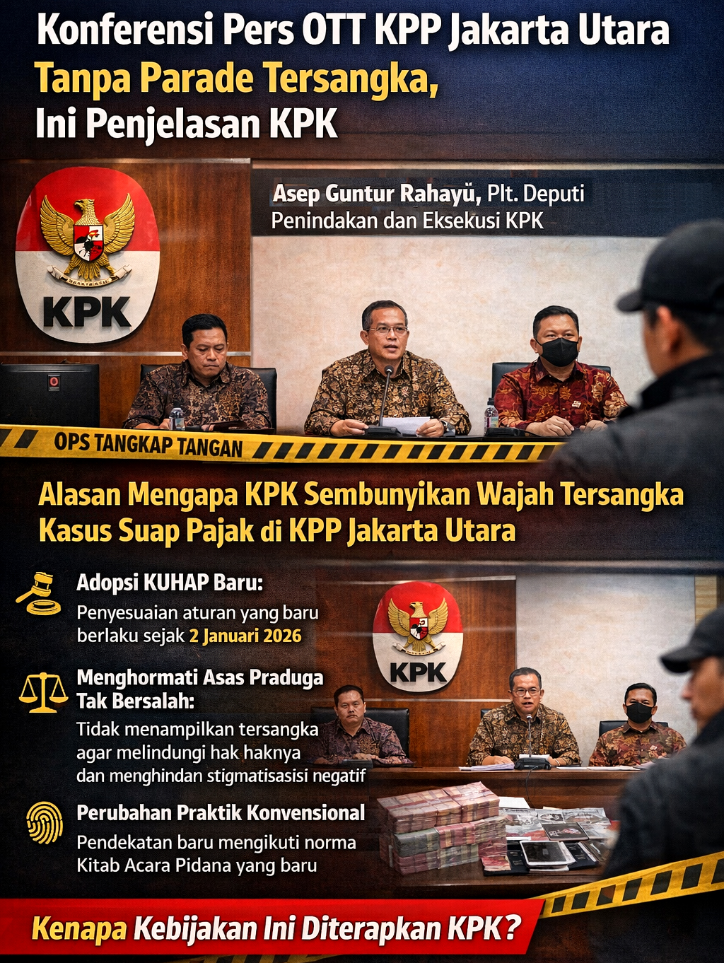 JAKARTA – Konferensi pers Komisi Pemberantasan Korupsi (KPK) terkait operasi tangkap tangan (OTT) di Kantor Pelayanan Pajak (KPP) Madya Jakarta Utara pada 9–10 Januari 2026 berlangsung berbeda dari biasanya. Pada pengumuman kasus tersebut, KPK tidak menghadirkan para tersangka secara fisik di depan media, seperti rompi oranye dan barisan tahanan yang selama ini kerap ditampilkan.