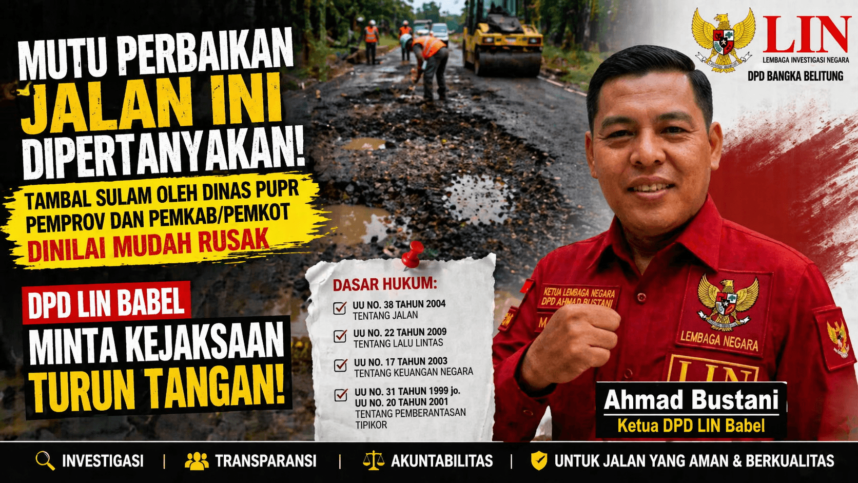 DPD LIN Babel mendesak aparat penegak hukum, khususnya Kejaksaan, untuk segera turun tangan melakukan penyelidikan terhadap proyek-proyek tambal sulam jalan yang diduga tidak sesuai spesifikasi.