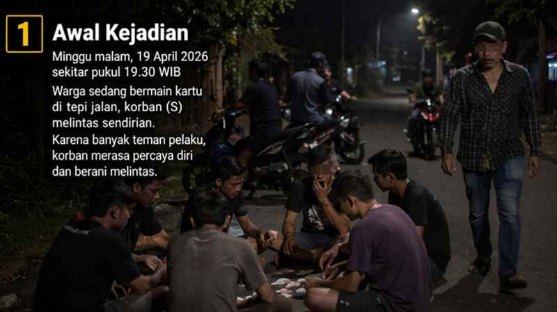 Berdasarkan keterangan awal warga, insiden bermula saat sejumlah pemuda tengah berkumpul dan bermain kartu di tepi jalan. Korban S yang melintas kemudian dicurigai sebagai pelaku pencurian sepeda motor.