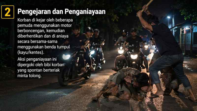 Tanpa verifikasi lebih lanjut, sekelompok pemuda yang diduga dipimpin R cs langsung melakukan pengejaran menggunakan beberapa sepeda motor. Korban akhirnya berhasil dihentikan dan diduga dikeroyok secara bersama-sama menggunakan benda tumpul.