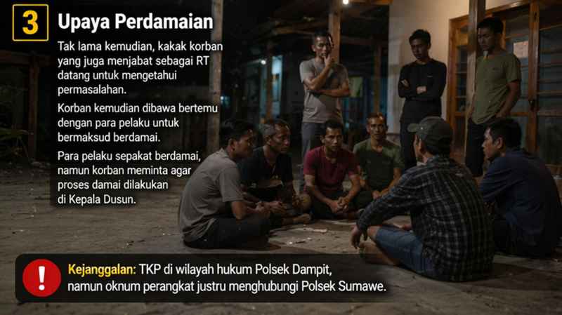 Tak lama berselang, kakak korban yang juga menjabat sebagai Ketua RT berupaya mencari jalan damai dengan mendatangi para pelaku. Namun, korban menginginkan proses mediasi dilakukan di kantor Kepala Dusun.