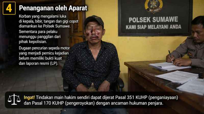 Akibatnya, korban justru diamankan di Polsek Sumawe, sementara para terduga pelaku pengeroyokan belum langsung ditindak, hanya menunggu pemanggilan.