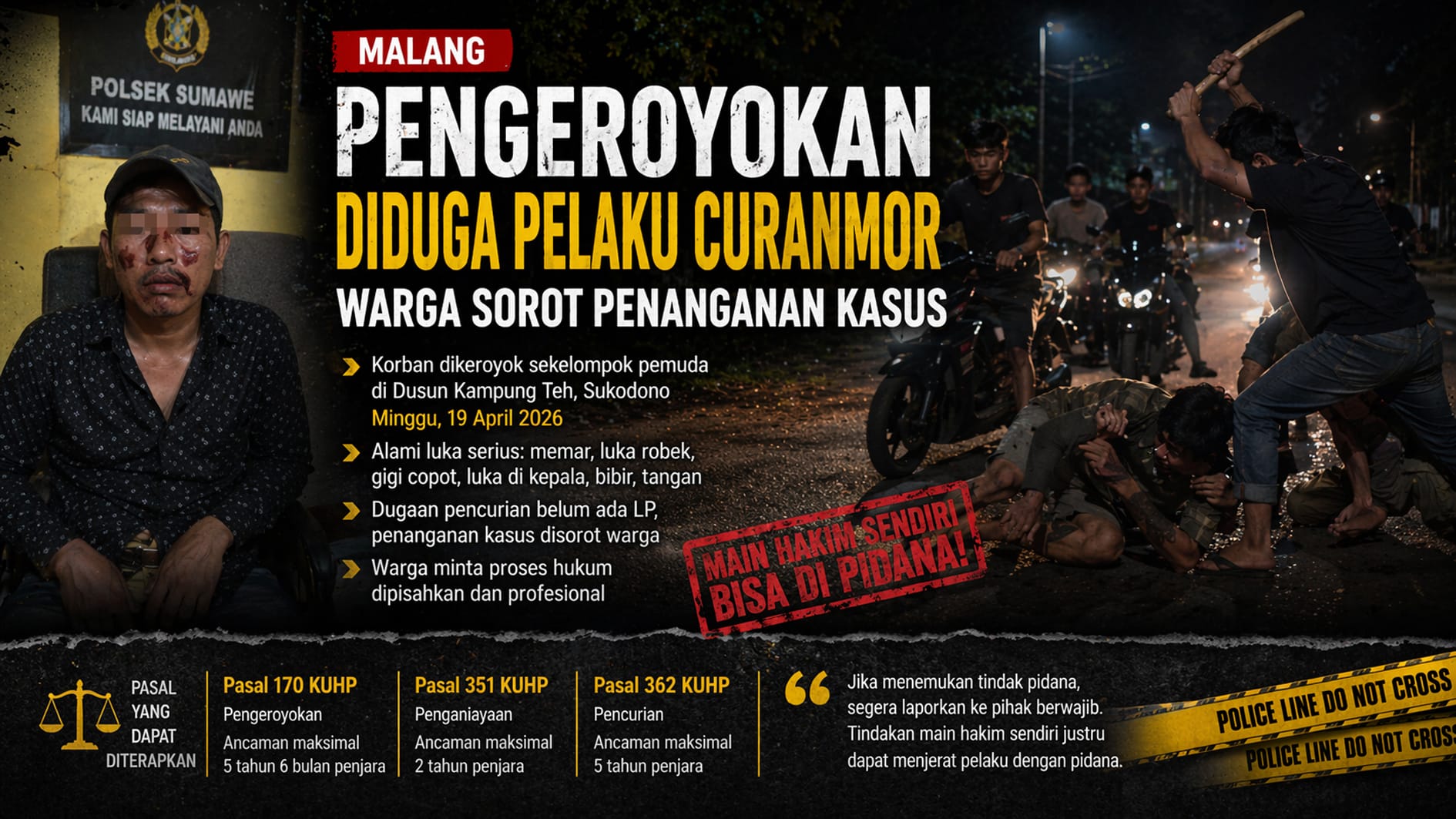 Malang – Dugaan tindak pidana pengeroyokan yang dilakukan sekelompok pemuda terhadap seorang pria berinisial S, yang diduga sebagai pelaku pencurian sepeda motor, kini menjadi sorotan warga di Desa Sukodono, wilayah hukum Polsek Dampit, Kabupaten Malang.