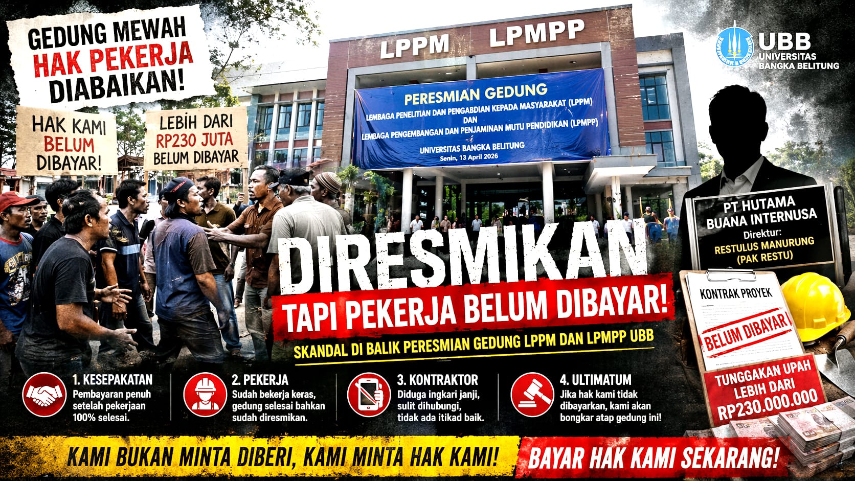 Balunijuk Bangka – Di balik gemerlap peresmian Gedung Lembaga Penelitian dan Pengabdian kepada Masyarakat (LPPM) serta Lembaga Pengembangan dan Penjaminan Mutu Pendidikan (LPMPP) di lingkungan Universitas Bangka Belitung (UBB), terselip ironi pahit yang memicu amarah para pekerja proyek. Hak mereka yang belum dibayarkan justru menjadi noda serius di tengah seremoni akademik yang digelar pada Senin (13/04/2026) lalu.