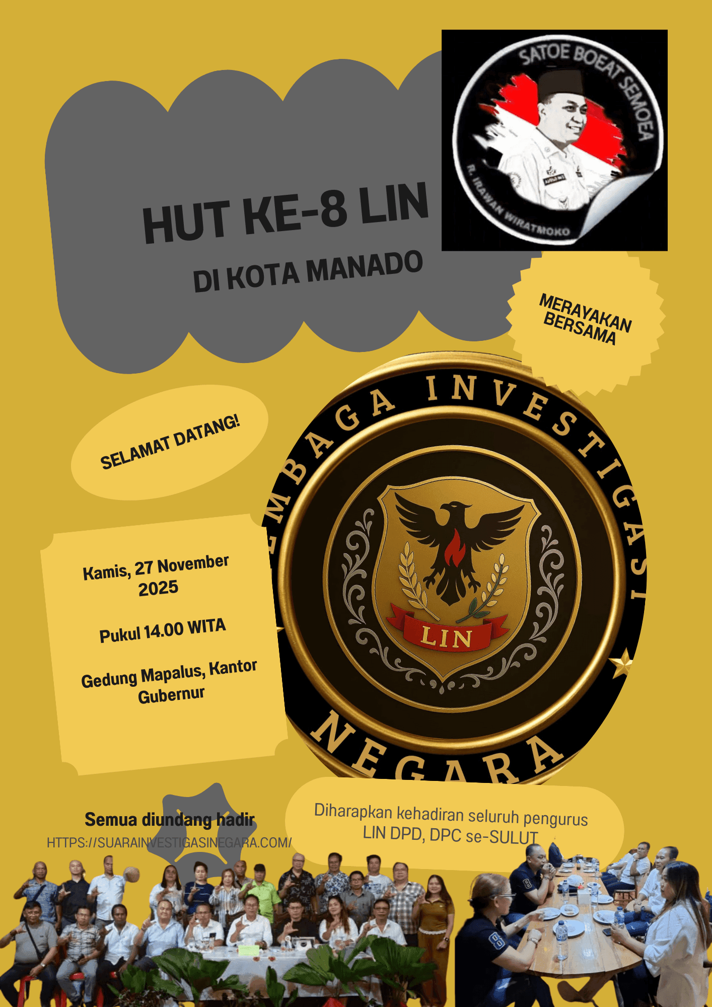 Home News PERIAPAN HUT LIN DI KOTA MANADO News PERIAPAN HUT LIN DI KOTA MANADOsmith jefry25 November 202525 November 2025 Related News GPPB Jalin Komunikasi Kawal Maladministrasi Berjamaah Pemprov Babel Dinas Perumahan dan Kawasan Permukiman Serahkan Data Informasi Publik Babak Baru Sengketa Lahan AP Pettarani, Busrah Abdullah Kembali Datangi Lokasi Eksekusi Acara Reuni 29 Tahun Pengabdian Prajurit Angkatan 97-01 ( Sejuta ) Wilayah Korem 091/ASN untuk NKRI Pimpinan Redaksi Mello TV News Kunjungi Sekretariat DPP LIN, Bahas Peran Media sebagai Kontrol Sosial Ketua DPD LIN Kota Makassar Laporkan Dugaan Penyalahgunaan Logo Lembaga ke Aparat Penegak Hukum Post Views: 98 CommentRead AlsoDPD Sulawesi Utara mempersiapkan HUT LIN November nantiDiduga Oknum Kepala Desa Terlibat Dalam Aktifitas Tambang IlegalKetua Umum LIN Bantu korban penganiayaanDPRD Tuban Terkesan Masuk Angin Saat LIN Ajukan AudensiKESETIAAN Adalah Harga TertinggiKetum LIN (Lembaga Investigasi Negara) Gus Robi sialahturahmi ke Kodim 0811 dan Polres Tuban