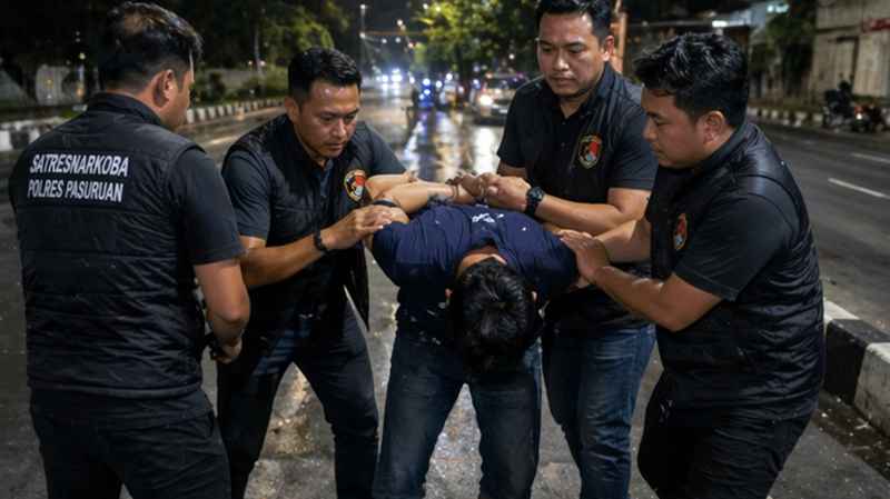 Penangkapan dilakukan pada Rabu malam (11/03/2026) sekitar pukul 22.30 WIB di depan Perumahan Griya Pandaan, Desa Sumber Gedang, Kecamatan Pandaan, Kabupaten Pasuruan.