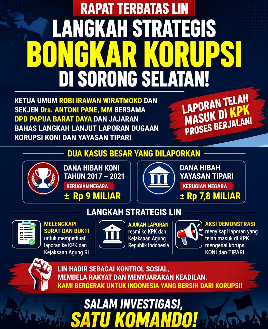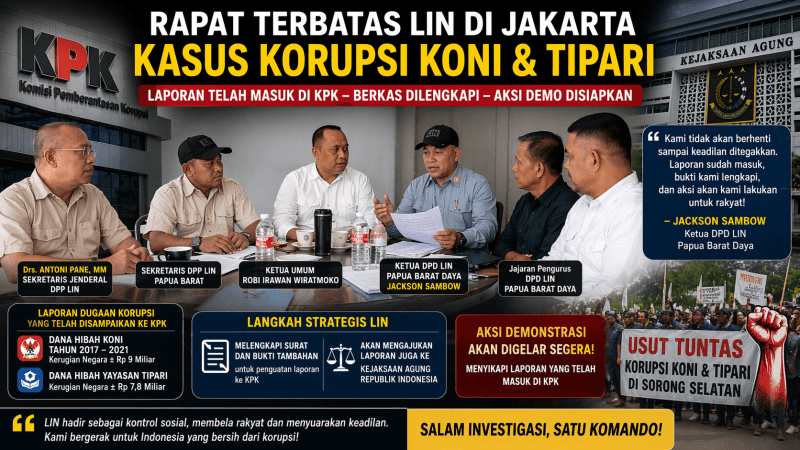 Dalam rapat terbatas yang digelar di Jakarta, jajaran DPD LIN Papua Barat Daya bersama pengurus pusat membahas langkah lanjutan terkait laporan dugaan korupsi Dana Hibah KONI dan Yayasan Tipari yang sebelumnya telah resmi diserahkan ke Komisi Pemberantasan Korupsi (KPK).